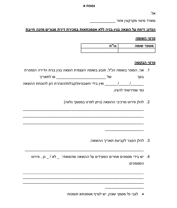1. מוכר שיודיע למנהל כי אין בידיו אסמכתאות, יצרף להצהרה/לדרישת המנהל טופס "דיווח על הוצאה בגין בניה במכירת דירת מגורים מזכה ללא אסמכתאות" (כשהוא מלא וחתום) (הטופס מצורף בנספח א').